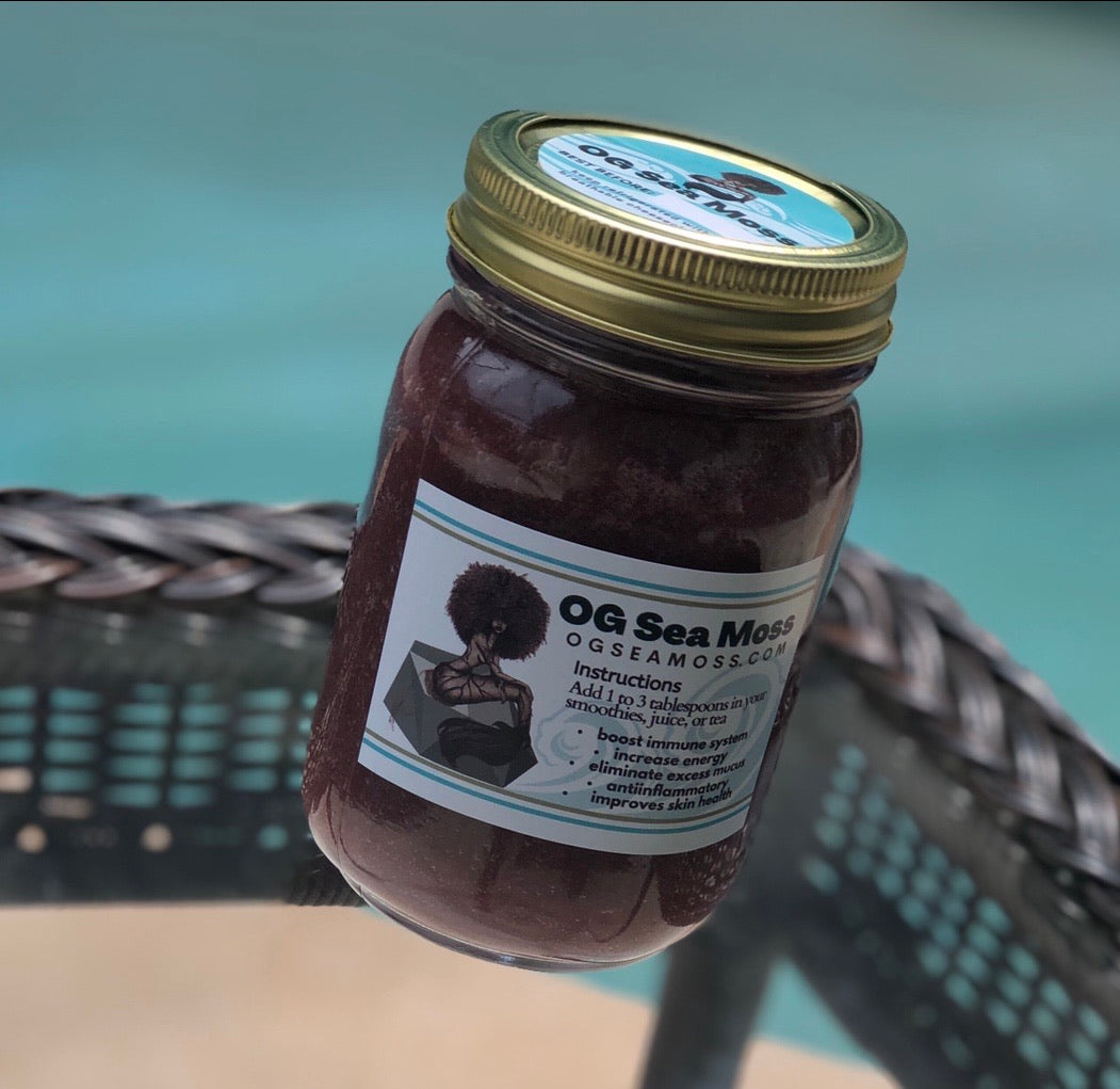 Our Unique Blend has the following ingredients: Golden Sea Moss (Gracilaria), Mullein, Organic Elderberries, Lemon, Cloves, Ginger, Cinnamon, Agave Nectar, Natural Spring water