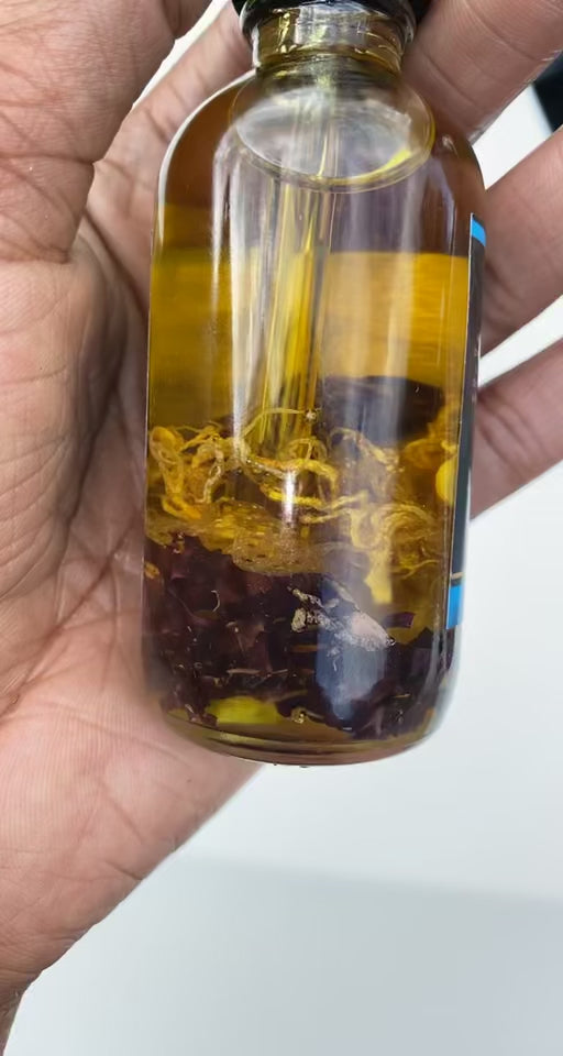 After Using our Sea Moss Hair Hydration Spray apply one dropper of oil in the palm of hands and apply to hair to loc in moisture. Oil alone is not moisture.